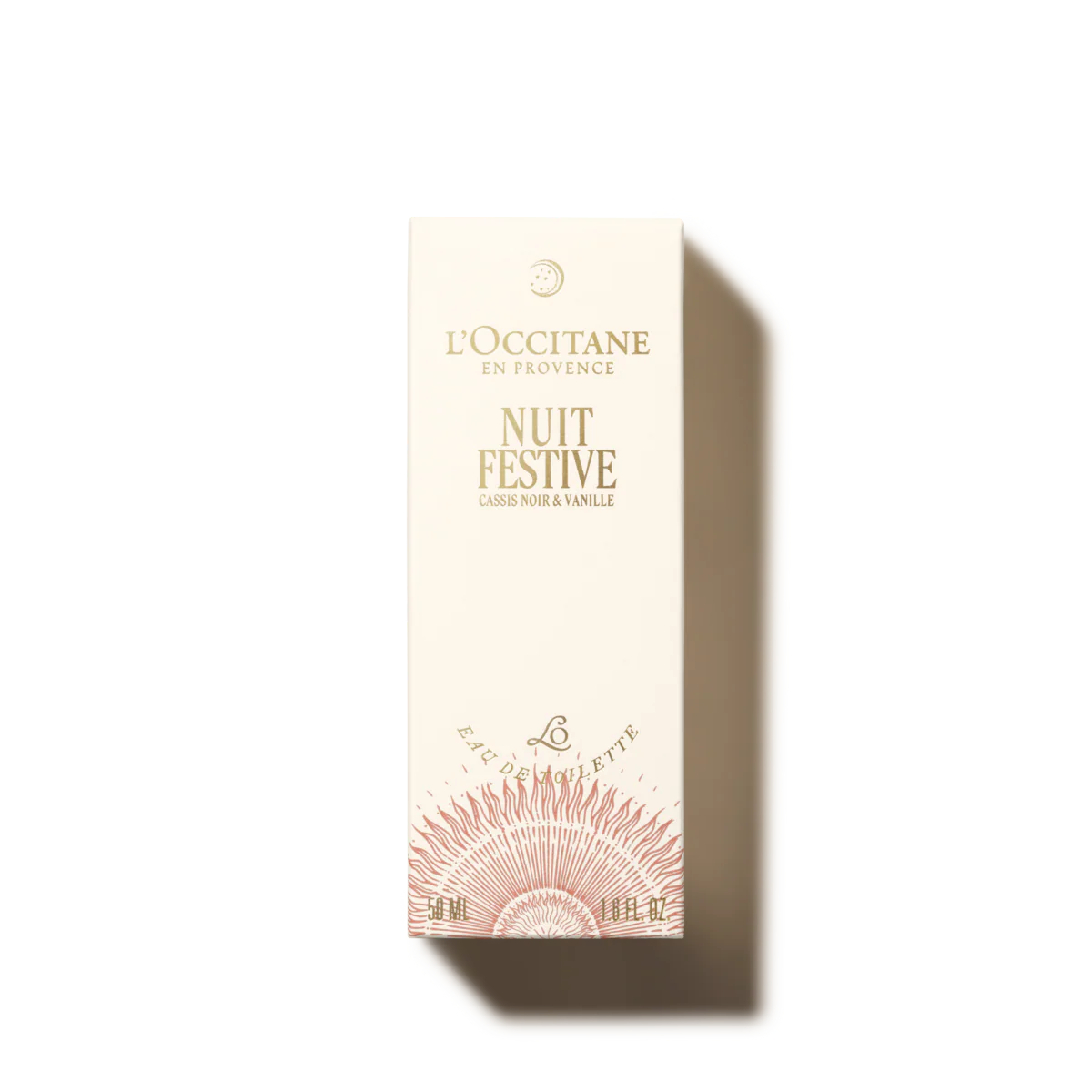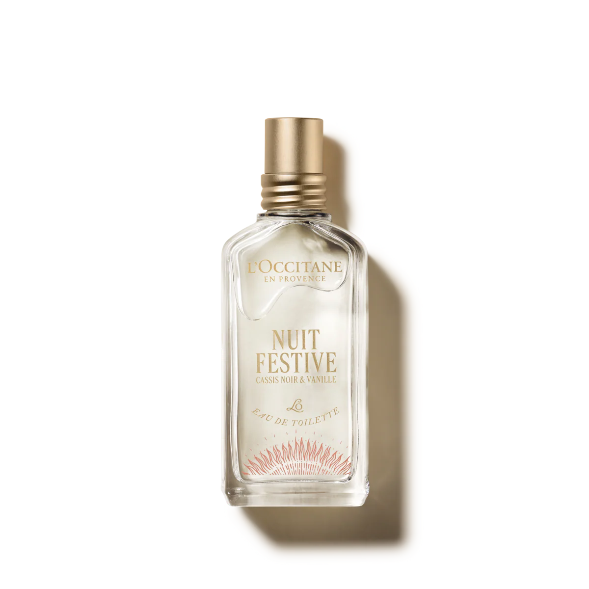 Nuit Festive Eau de Toilette reveals a luxurious fragrant harmony of blackcurrant, creamy almond milk and delicate vanilla. This radiant composition conveys a sense of joy and comfort on a winter night, enveloping the skin in a subtle, warm scent. Ideal for moments when you want to radiate sophistication and warmth.